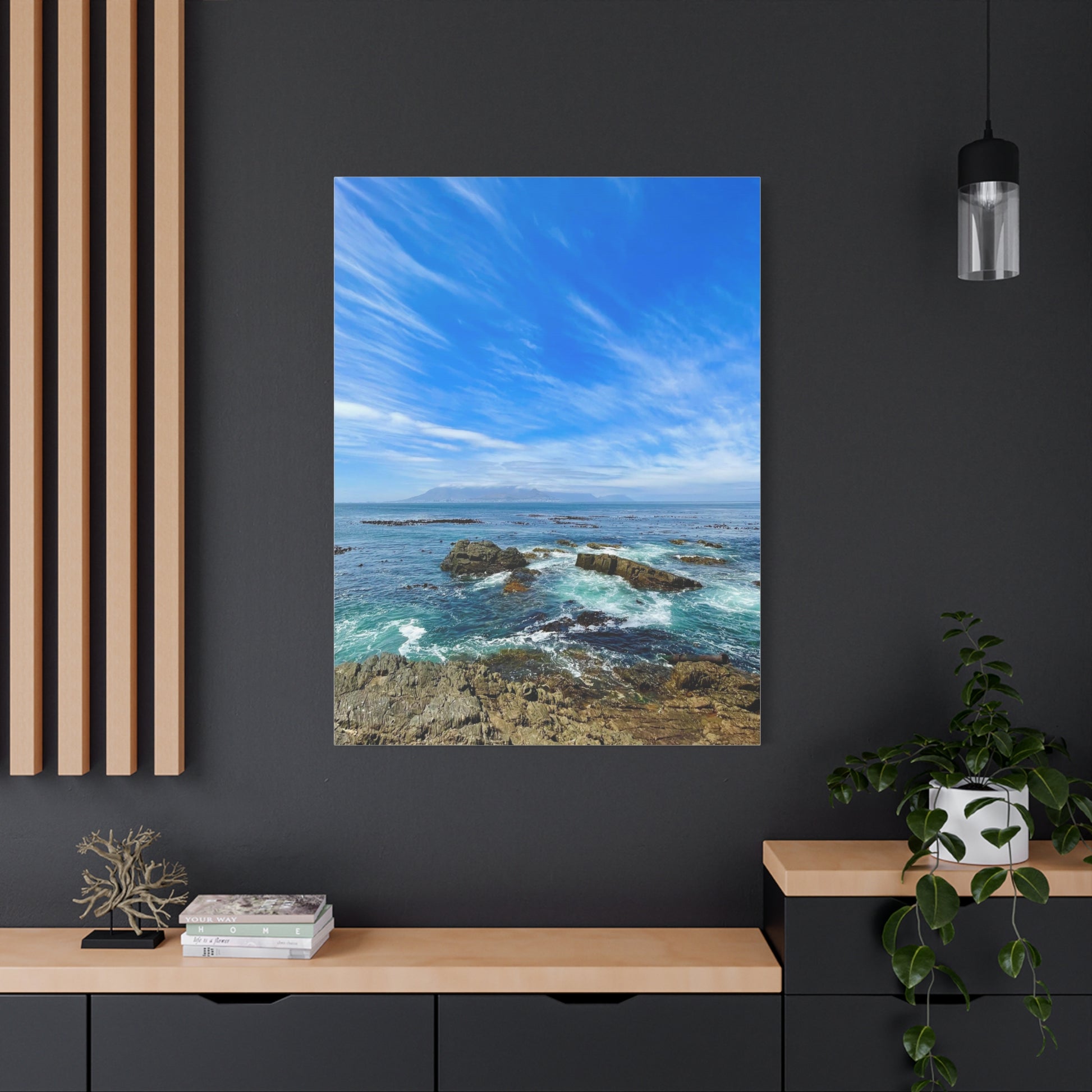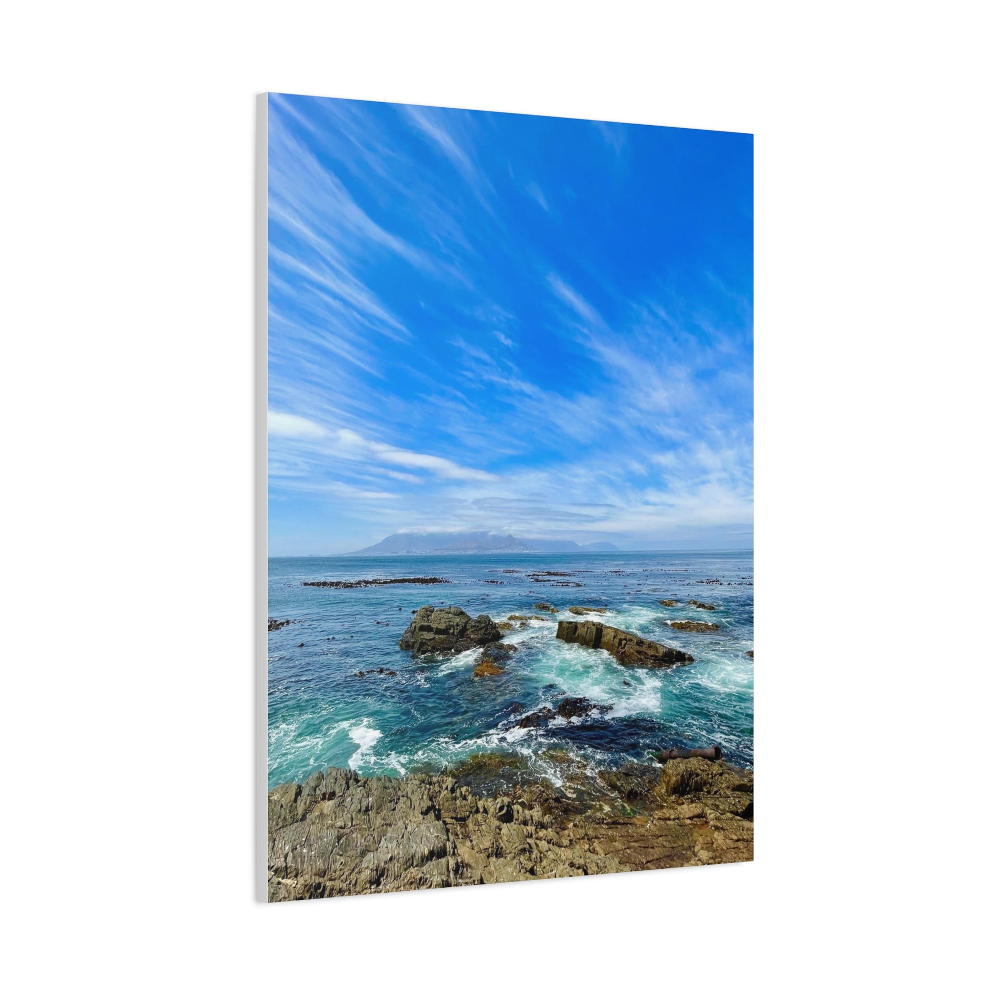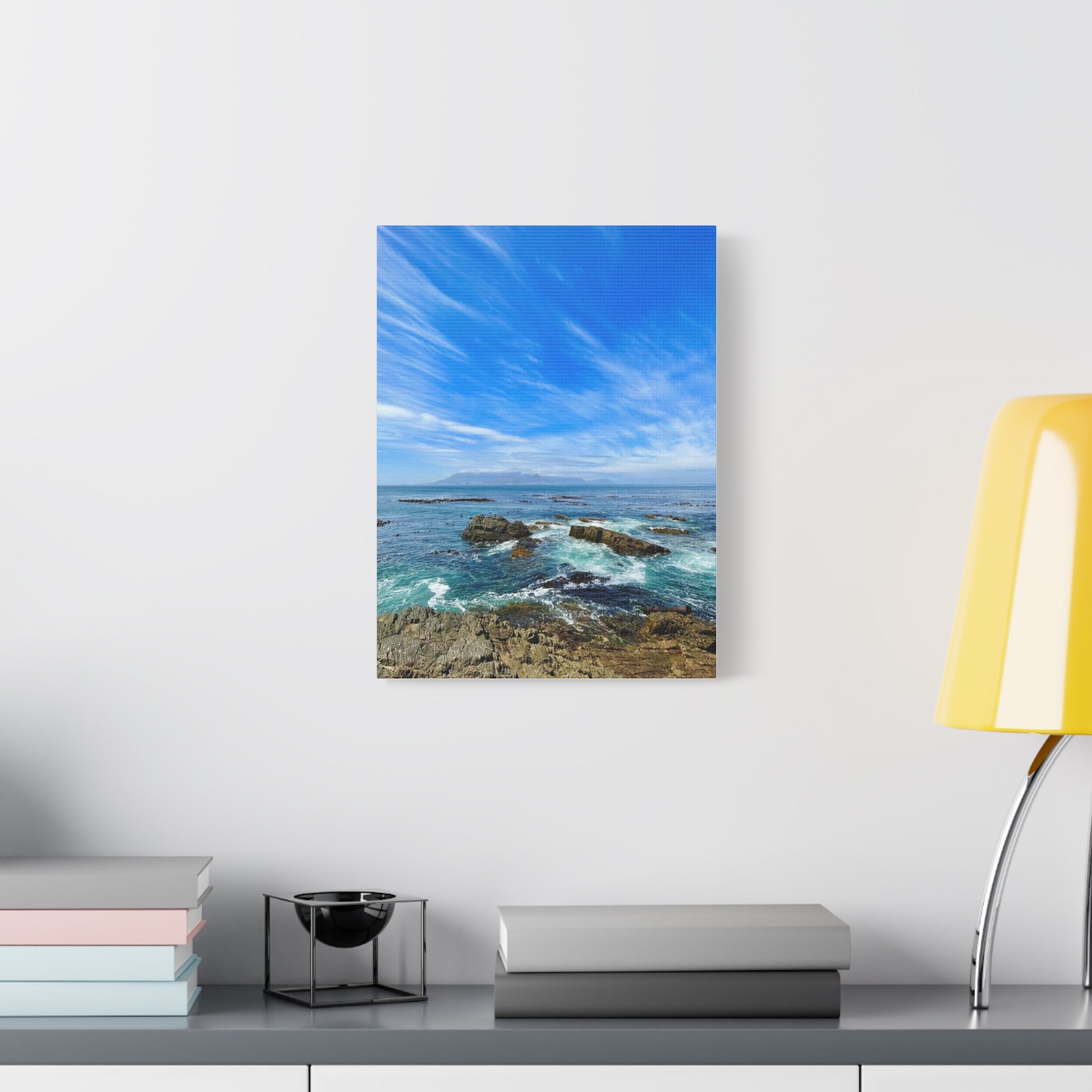 Captured along the rugged coastline of Robben Island, South Africa — the island where Nelson Mandela was imprisoned for 18 of his 27 years — this canvas blends turquoise waves, jagged rock formations, and brilliant blue skies. A powerful piece of natural beauty combined with deep historical meaning.
